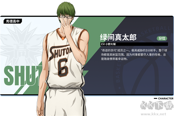 3、绿间真太郎 - 分位:"奇迹的世代" 成员,超远 3 分威胁巨大,因追求完美,常携带幸运物。