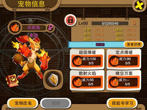 首先从火宠说起主要是因为大家进入游戏,陪伴大家的第一个宠物就是火系的小火兔(后面简称兔子)。虽说兔子是人手一只,而且进化前只是蓝色的精英宠物,但是请千万不要就小看了兔子。兔子推图、PK其实都是相当不错的。而且兔子是遗迹里唯一一个能从精英进化到史诗级别的宠物,这也突出了他的特别。因为精英级别的宠物培养到S要的钱比史诗级别的少接近80W银币,而且潜能只需要蓝色的高级潜能石而不是紫色的特级潜能石。因此特别推荐兔子在进化前培养到S并且打好潜能——适应力。如果银币不够或者潜能石不够可以先升级不进化。