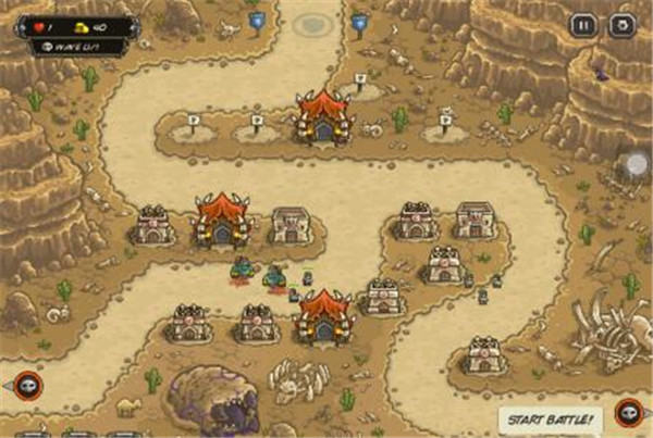 攻略:本关的重点在于死守中央路口,初始布局建议左侧弓箭塔,魔法塔;中下部弓箭塔,炸弹塔;右侧弓箭塔;中部步兵塔,弓箭塔(参考图片一)。有资金后在中部补充1座弓箭塔,1座步兵塔以稳固中央防守,增援还是冷却就用。然后升级,本关的塔可以升1级,优先升级中央的步兵塔,然后是左侧的魔法塔,再后是中央的弓箭塔和中下的炸弹塔。本关二级沙漠兵较多,在其于中央集中时用火雨。后期可酌情在后方补箭塔,总的来说本关难度不大,我通关时还有600多金