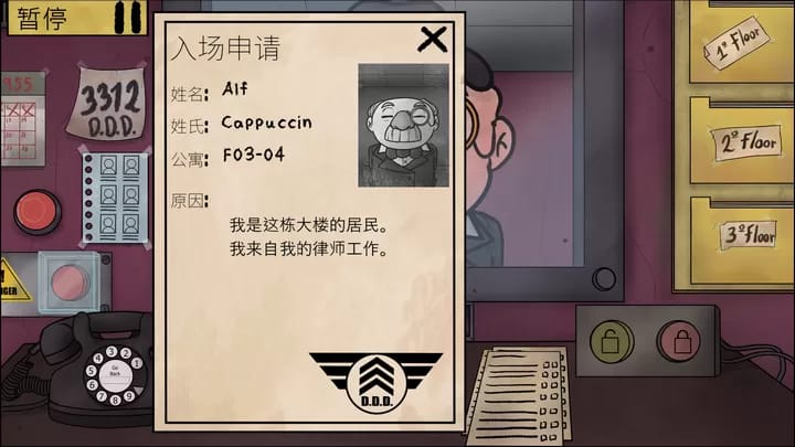 作为建筑物的看门人,玩家的角色由普通的门卫变成了保护租户的英雄,玩家必须阻止这些冒名顶替者进入的企图。玩家可以通过审查用户资料,检查身份证、确认公寓号码,甚至拨打验证电话来判断进入建筑的是人还是危险的生物