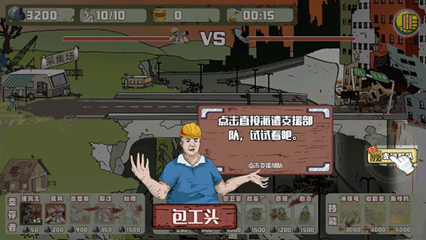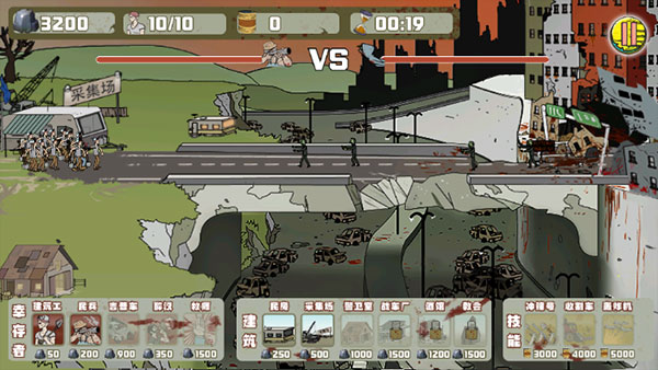 你可以生产厂房增加人口上限,可以招募工人、火枪队、战车来对抗僵尸,目的就是防御好自己的基地,并且拆除僵尸盘踞的大楼。如果想要更好的对抗僵尸,建造能够生产资金的厂房是必不可少的,当你击败僵尸获得的积分累计到一定程度时,还可以施放积分大技能,对僵尸军团进行一次大冲击哦!!