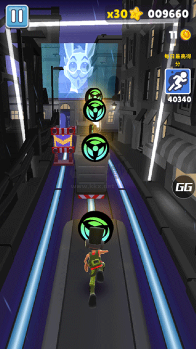3、跑酷途中遇到的道具不要错过,它们会为你增加得分,并且还能保命。