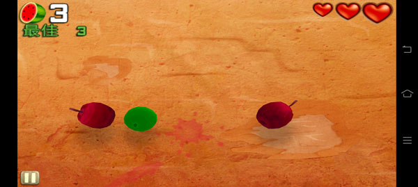 1、一个全新的三滴血设置:原来的3个红叉叉成了"靴猫"的3流血,每掉一个水果就掉一滴血。