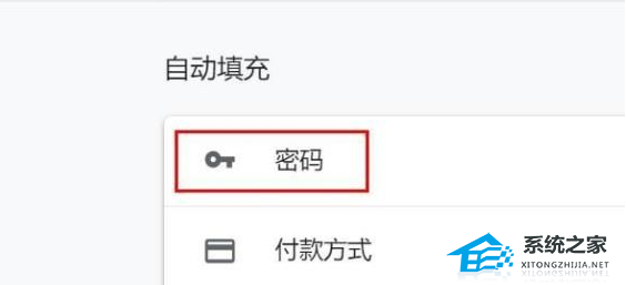 2、在设置菜单中找到“自动填充”选项,点击下方“密码”按钮。