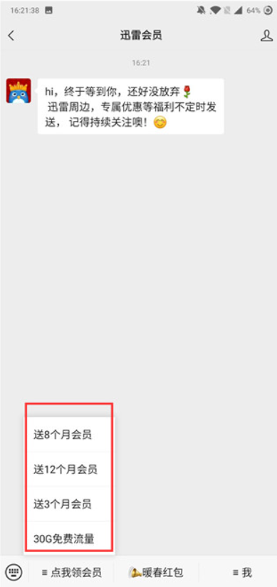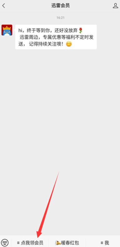 2、关注后,官方会自动发送一个欢迎信息,点击菜单栏的"点我领会员"。