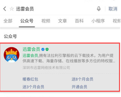 1、手机微信搜索"迅雷会员”,找到并关注迅雷会员公众号。