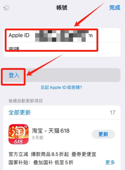 10、在倒回来,把我们新购买好的台区的apple ID和它的密码填写上,点击【登入】。