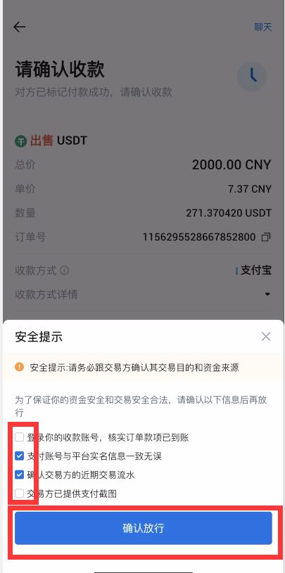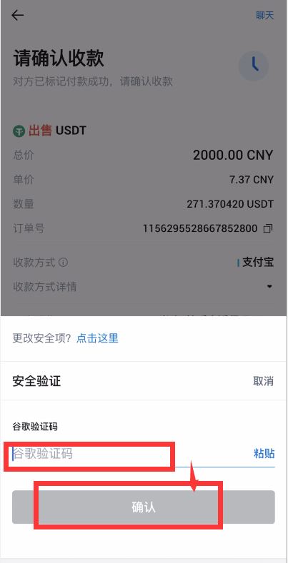 第三步:等待买家付款,可以点击“聊天”按钮进行付款进度沟通,买家确认付款后,需要登录收款账号核对订单款项是否到账、支付账号与平台实名信息是否一致,交易方的支付截图与交易方近期的交易流水等信息,确认无误后再点击“确认放行”,输入谷歌验证码点击确认后对方将收到您出售的USDT,完成交易。
