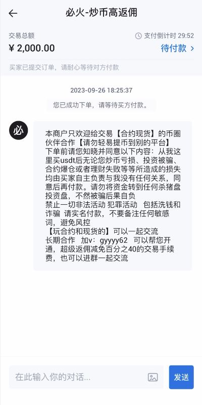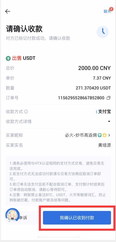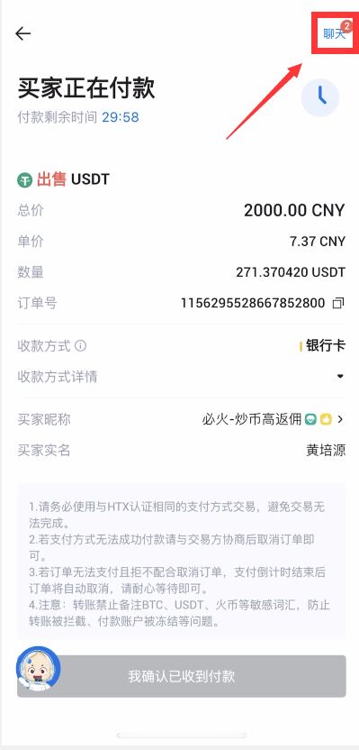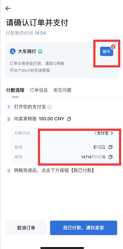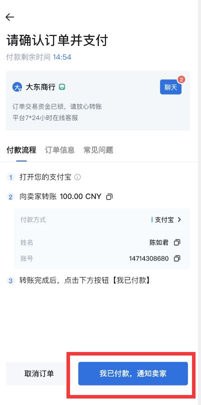 第三步:点击“聊天”按钮查看商家要求,根据商家要求与商家确认后按照页面显示的付款信息给商家打款,打款完毕后点击“我已付款,通知卖家”,商家确认收款后放币完成交易
