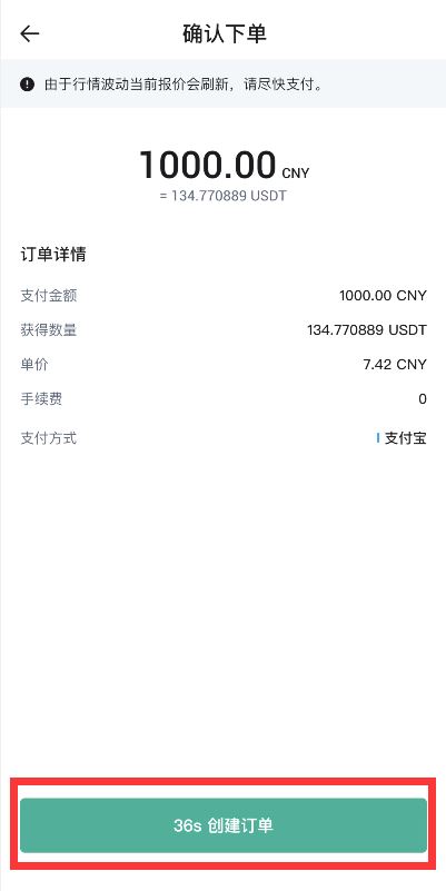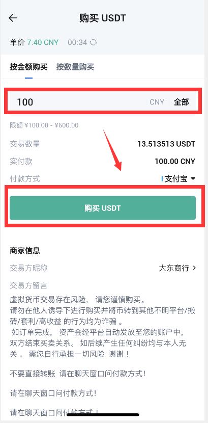 第二步:输入购买金额,点击“购买USDT”,选择付款方式,点击“购买USDT”进行下单