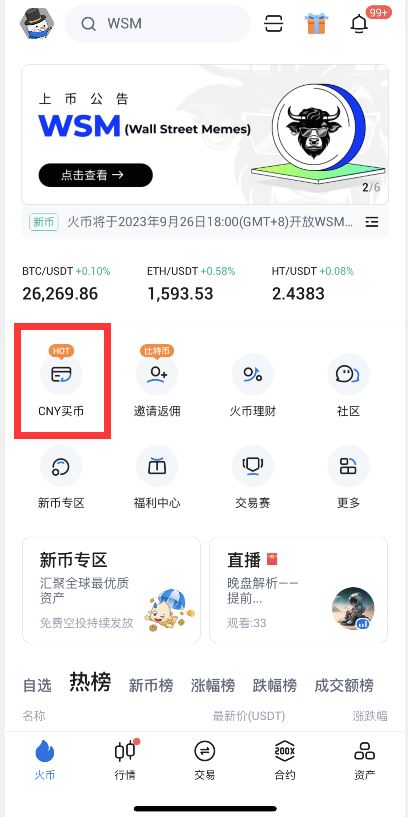 第一步:打开火币APP(官方注册、官方下载),点击“CNY买币”进入C2C买币页面,点击左上角,选择快捷交易模式