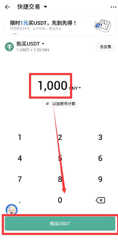 第二步:填写需要购买的金额或者购买数量,点击“购买USDT”进行下单