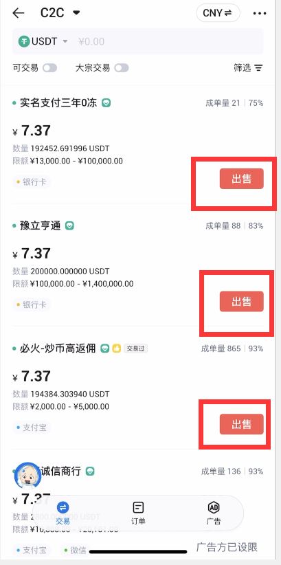 第一步:打开火币APP(官方注册、官方下载),点击“CNY买币”,点击“出售”,选择合适的广告点击“出售”按钮进入到下单页面