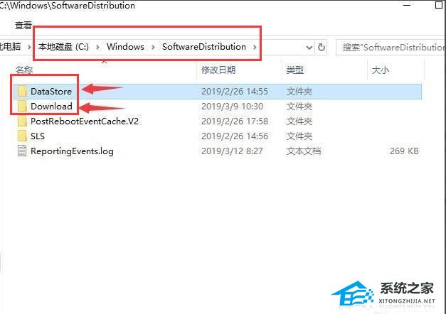 2. 删除路径 C:WindowsSoftwareDistributionDataStore和C:WindowsSoftwareDistributionDownload下的所有文件。