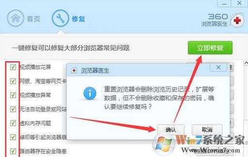 2、点击【修复】,将下面所有选项勾选,同时需要勾选底部的【浏览器功能异常】,点击立即修复即可!
