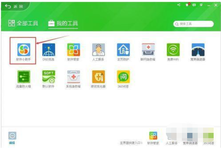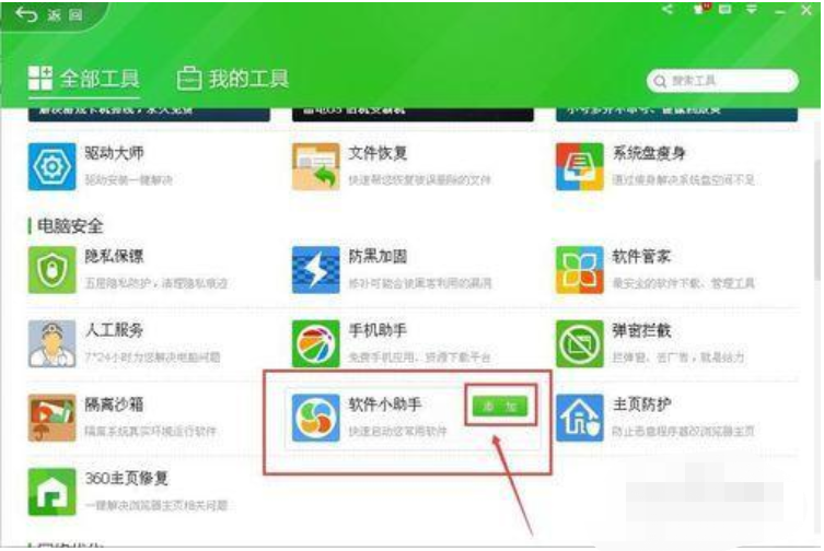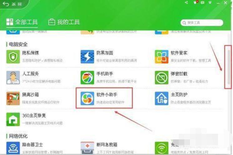4、还有一个方法就是可以点击360安全卫士的“更多”后在出现的“全部工具”窗口中直接把滚动条往下拉,我们在中间的位置就会看到有“软件小助手”这一项,如图所示:
