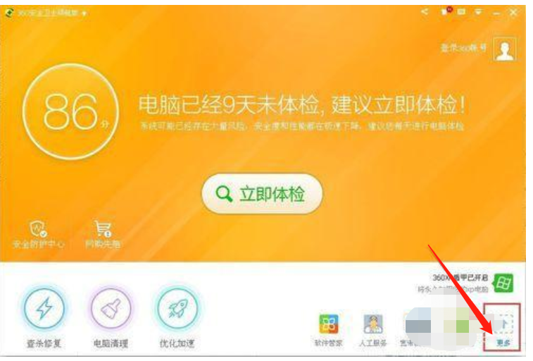 1、在电脑打开360安全卫士,可以点击右下角的“更多”,如图所示:
