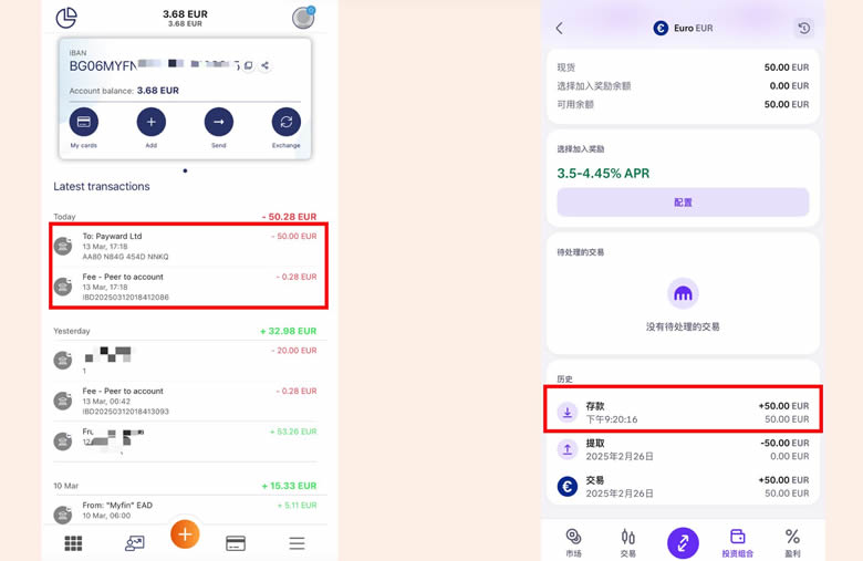 汇款成功之后回到主页会提示你这里扣款50加0.28欧元的汇款费用,这个可能不是及时扣款显示的,实际上我是第二个工作日才开始扣款并汇款成功,所以如果你没有汇款成功,耐心等待一下。然后我们回到海妖交易所就可以看到50欧元的存款已经到账了。