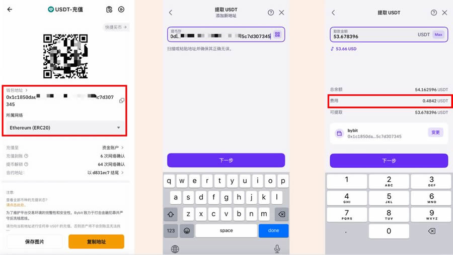 这个时候我们需要先去欧易、币安或者Bybit呢拿到这个ERC20的钱包地址,我飞哥这里以Bybit为例,拿到这个ERC20的钱包地址之后呢,回到海妖交易所填写钱包地址,添加地址之后我们就可以往这个钱包转U了,我们输入取款的USDT的金额数量,可以看到网络费用是固定0.48U,然后点击下一步。
