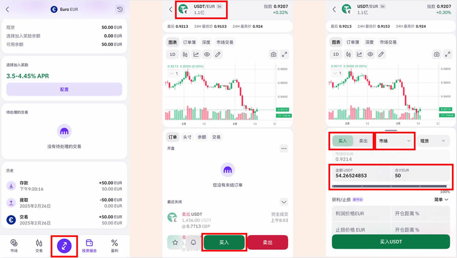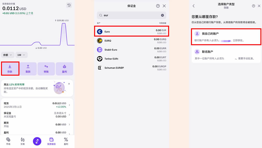 首先呢我们点击下方菜单栏的投资组合,点击存款,然后资产这里选择欧元,然后帐户类型选择「我自己的账户」。