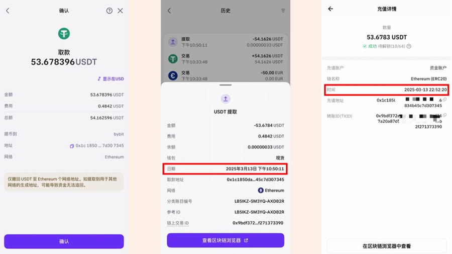 下一步就是确认取款,然后提款就成功了,然后我们去到Bybit看一下到账时间,22:52分,而转U的时间是22:50分,也就是2分钟左右到账了, 是非常快的。
