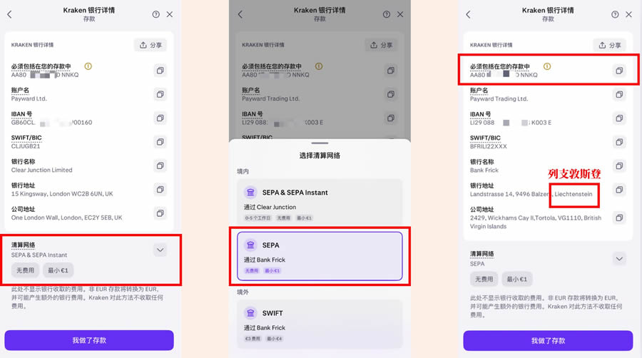 然后我们的银行详情就会更新,可以看到银行地址这个国家是这个,也就是列支敦斯登,一个欧洲内陆国,我们汇款的时候需要用到这个国家。同时要注意汇款的时候需要填写一个汇款参考,一定要把这个填写进去,因为海妖交易所提供的是公户,只有通过这个汇款参考才能识别出你的身份,快速的把钱打到你的海妖账户上去。
