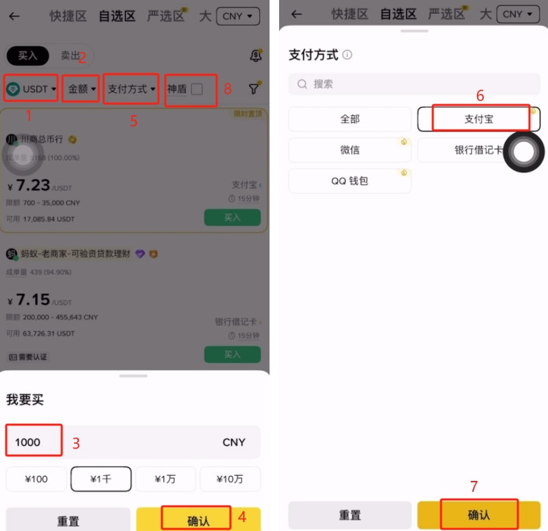 一定要记得再次勾选一下神盾商家,我们在卖USDT的时候要比买USDT更加的谨慎。因为我们是实际会收到商家打给我们的人民币的,如果商家他打给我们的币是黑钱,那么我的银行卡、支付宝、微信就很有可能被冻结。所以在这一块我们一定要谨慎再谨慎的去筛选商家。