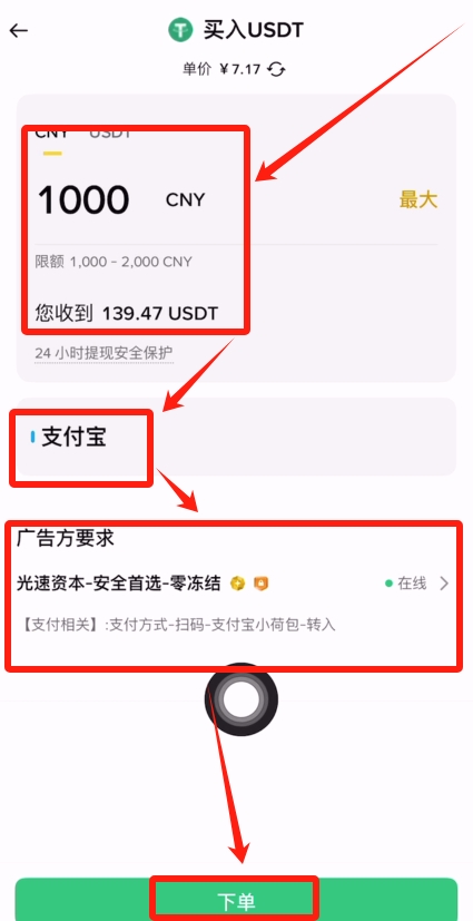 5、我们输入1000人民币,下方会自动为我们算出来将收到139.47颗USDT。我们支付的方式是支付宝,下方还可以看到广告方的需求,我们的支付方式是在支付宝使用小荷包进行转入,点击【下单】。