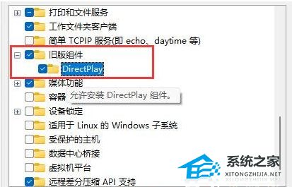 4、打开Windows 功能组件列表,找到并勾选旧版组件下的【DirectPlay】,再点击【确定】,即可设置完成。
