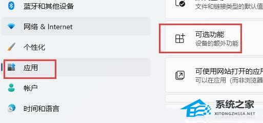 2、设置窗口,左侧点击【应用】,右侧点击【可选功能(设备的额外功能)】;