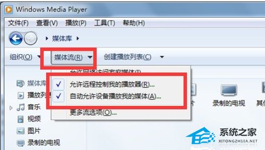 7. 点击左上角“媒体流”,勾选如图所示的两个选项就可以投屏了。