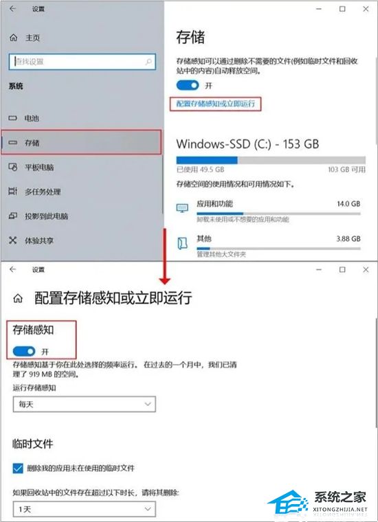依次点击电脑的【开始】—【设置】—【系统】,在“系统”下的菜单栏中选中【存储】,在右侧找到“配置存储感知或立即运行”这行小字,并点击进入。在出现的新页面中,直接把“存储感知”下的开关打开。