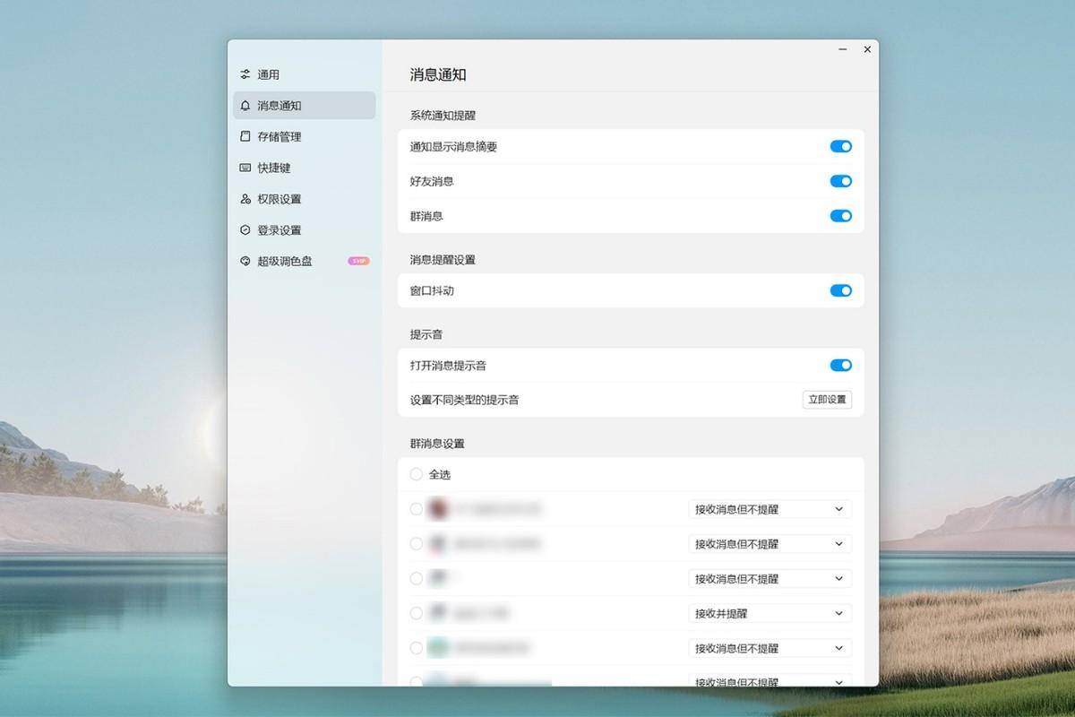 消息通知,可说的不多。因为聊天界面简化了,这里的设置项也做了一些简化,比如不会再有什么"对方正在偷人…"之类的信息展示。