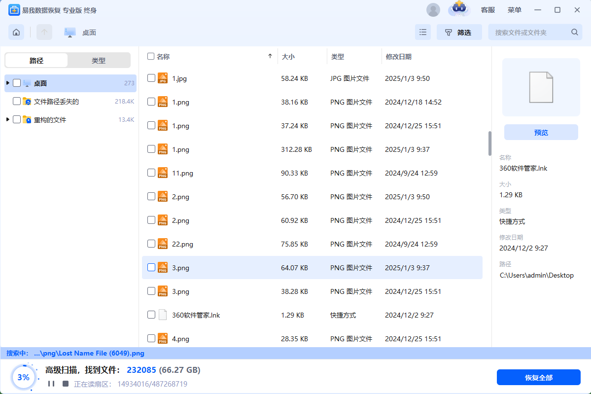 当然,如果桌面杂乱并将其还原之后,又发现某些重要文件丢失的话,我们可以使用一些专业的文件恢复软件将其恢复,如易我数据恢复(EaseUS Data Recovery Wizard)。它能够直接扫描你的电脑桌面,然后找到并恢复因删除、格式化、部分病毒感染等多种原因导致丢失的文件数据。下面,我们看看这款软件如何恢复丢失文件的: