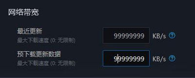 2、在设置界面左侧点击【游戏安装/更新】,然后在右侧将【网络宽带】下面的【最近更新】和【预下载更新数据】后面的速度都设置成99999 ,点击【完成】保存设置重启战网尝试进行更新安装!