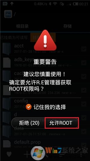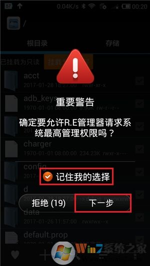 ①直接弹出警告提示界面,此时勾选"记住我的选择",并点击四次"下一步"和一次"允许ROOT"按钮。