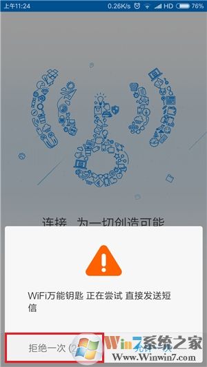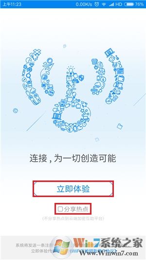 1.在手机端下载和安装,官方版本的WiFi万能钥匙软件并打开。然后在用户引导介绍部分左划三次,在最后一页记得先去掉"分享热点"复选框,然后再点击"立即体验"按钮继续,此时软件会尝试向指定号码发送短信,如果MIUI弹出警告提示,则需点击"拒绝一次"按钮。