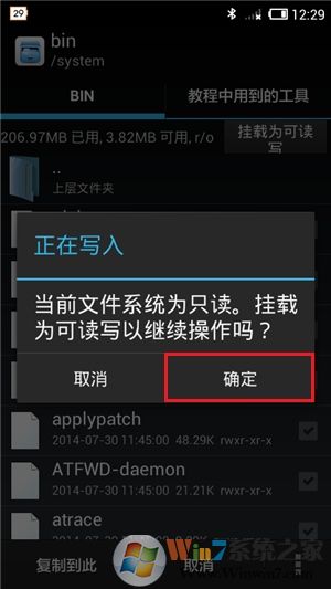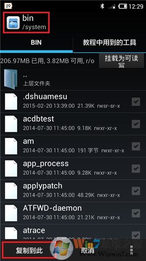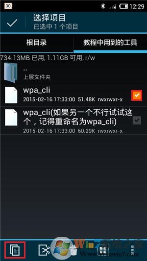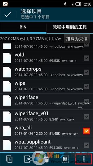 由于安卓默认不支持验证PIN码连接无线网络,故必须将相关的驱动功能植入系统中,否则无法通过该软件实现暴破PIN码。先在文末附件中下载名称为"wpa_cli"的内核文件,到手机虚拟内存的任意位置中,然后打开R.E管理器并在右边的"存储"一栏中,找到其所在位置后点击该文件右侧的勾将其选中,接着点击底端左侧第一个"复制"按钮,然后在左边的"根目录"一栏中,找到"/system/bin/"目录并点击"复制到此"将其拷贝到该位置。如果当前文件系统挂载为只读状态,此时会弹出修改挂载为可读写的提示框,直接点击"确定"键即可。