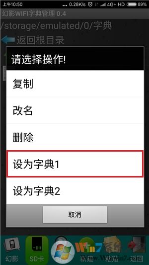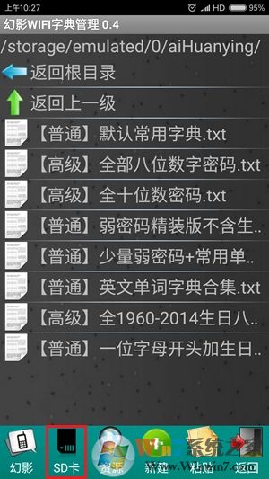 软件在此处已经提供了8个弱密码字典,如果要使用内存中已下载的字典文件,可以点击下方的"SD卡"选项卡,然后打开字典文件的存储位置,选择并长按一个要使用的字典文件,接着在弹出的操作菜单中点击"设为字典1"项即可,同理还可继续指定字典2文件。