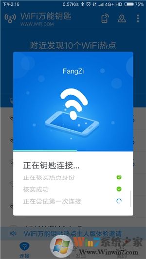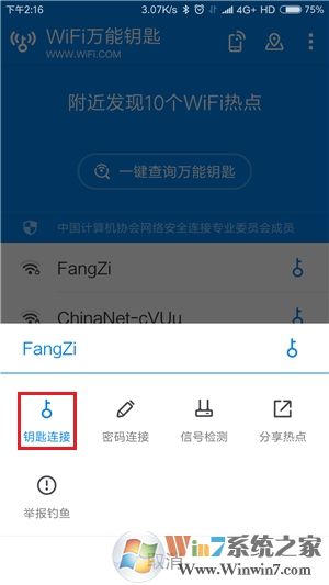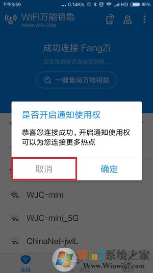 2.若此时手机没有通过热点连接到外网,则需要事先打开移动数据和WiFi功能。然后点击该软件"连接"界面中,最上方蓝色区域的"一键查询万能钥匙"按钮,此时软件会结合云端数据,搜索附近被其他用户分享过的热点,若找到对应的热点SSID名称后面会有一个蓝色的"钥匙"图标,然后需要点击信号最强的一个WiFi热点,接着点击"钥匙连接"按钮尝试快速连入,通常只需1-5秒钟的时间就能成功连上,如果是安装后第一次连接成功,还会弹出开启通知使用权的提示,为了避免自带的广告消息造成骚扰,此时建议点击"取消"按钮。
