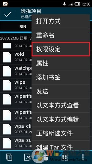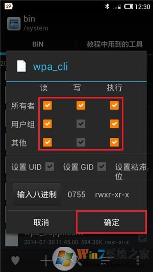 然后还需要为该驱动内核文件,设置正确的权限以便能够被软件正常访问和调用。在"/system/bin/"目录下点击"wpa_cli"文件右侧的勾将其选中,然后点击底端最右侧的"..."按钮,接着点击其中的"权限设定"菜单项,并在弹出的权限设置框中,设为允许本机全部用户有"读"和"执行"的权限,并只为文件所有者开启"写"的权限,即为该文件的权限属性设置为0755(rwxr-xr-x),最后点击"确定"键后重启手机该功能驱动即可生效。