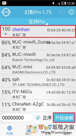 相关功能驱动文件被植入到系统中后,即可通过该软件实现暴破PIN码。打开幻影Pin软件后,在"列表"界面里的"支持Pin"一栏中,找到并点击选中信号最强的无线热点,然后直接点击右下角的"开始破解"按钮尝试进行破解操作。这个过程可能会很漫长,毕竟被破解的目标是8位数字,比不定长度的无线密码容易太多了,只需耐心等待一般都能成功。