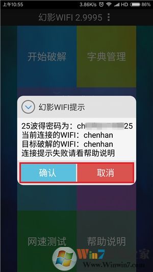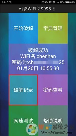 若字典中的某行密码,尝试连接目标热点成功,将立即停止破解并发出声音和推送通知。此时软件还会弹出破解成功的提示,点击"确认"或‘取消’按钮可将其关闭。此外在主界面第二行的蓝紫色区域中,或点击"破解记录"都可以查看上一次破解出的热点名称和密码。