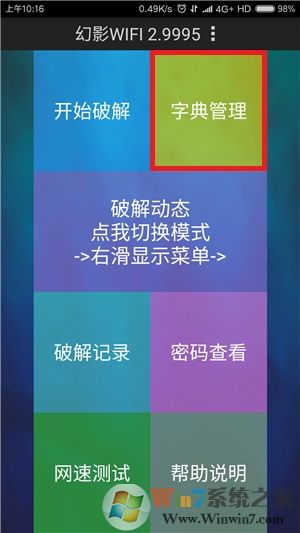 在手机端下载和安装幻影WiFi软件并打开,同时确保其WiFi功能已经开启,并删除所有会在该环境中自动连接的热点,以免对破解过程造成影响,然后在用户引导介绍部分左划三次,进入最后一页后点击"开始使用"按钮。接着在弹出的说明提示框中点击"确认"或"取消"按钮将其关闭,然后在主界面中点击"字典管理"并进入字典设置界面。