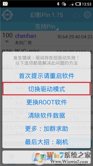 注意:1.运行该软件后若提示缺少驱动文件,请检查是否已将"wpa_cli"文件移动到"/system/bin/"目录下并赋予755权限,或把另外一个备用文件重命名后将其替换并重新赋权,亦可换一台设备或重新刷机后再尝试。