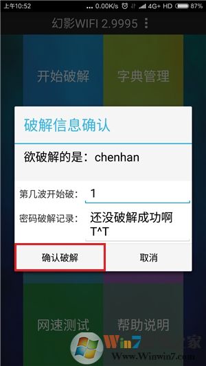 字典设置完成后即可开始暴破过程,返回程序主界面并点击"开始破解",然后选择并点击一个信号最强的WiFi热点作为破解目标,接着在弹出的确认对话框中,点击"确认破解"按钮即可开始进行暴破操作。此时程序会依次采用字典文件中的每一行字符,作为WiFi密码并尝试连入该热点直到成功,如果已经指定了字典2文件,将在字典1中的所有字符,全部尝试结束后直接跳转。这个过程可能会很漫长,可以将手机插到充电器上慢慢等待。