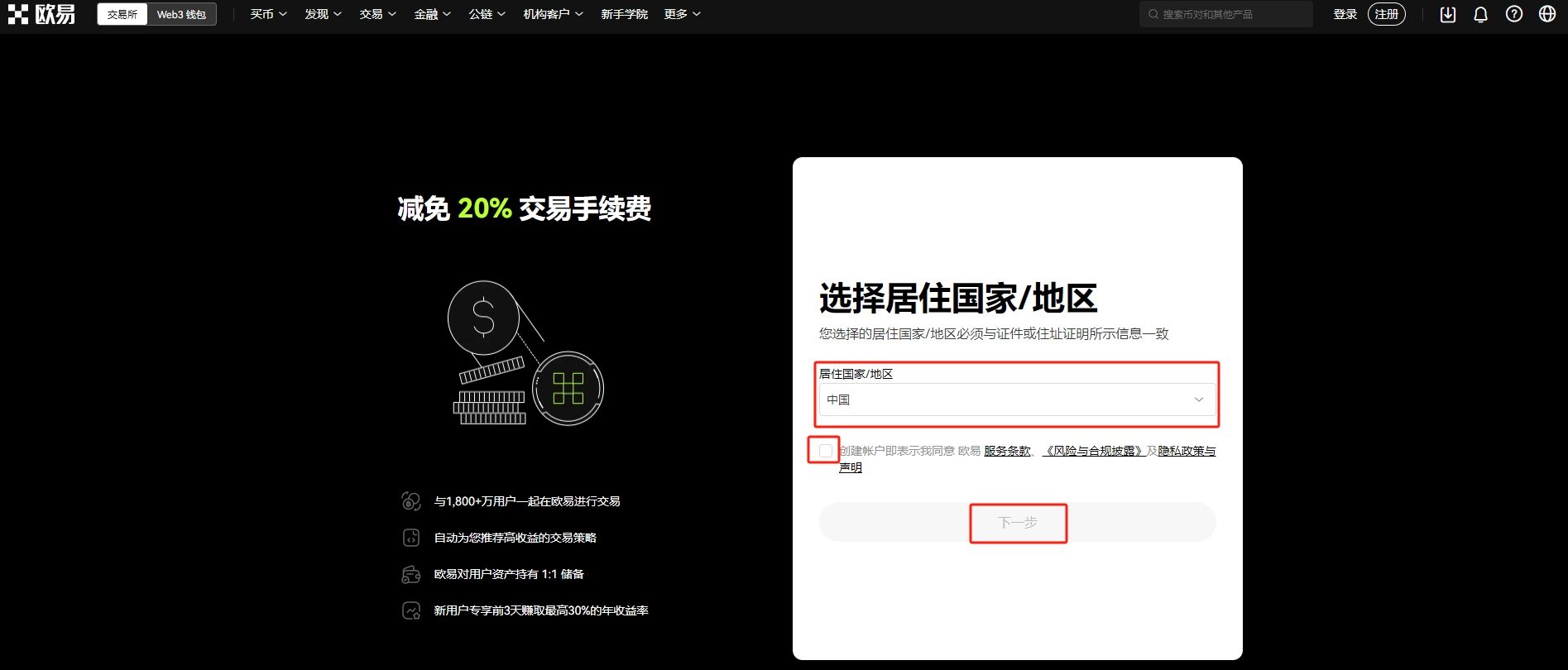 使用这个邀请码进行注册,可以让我们在后续的交易中永久享受20%的手续费优惠。可以看到这里它显示了,我们使用jbzj999注册,能够获得20%的返佣。点击【注册】。