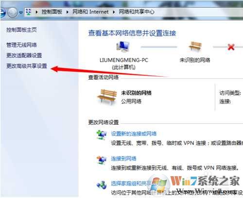 7、接下来我们还需要设置一下共享权限让共享更简单,打开网络和共享中心,点击更改高级共享设置;
