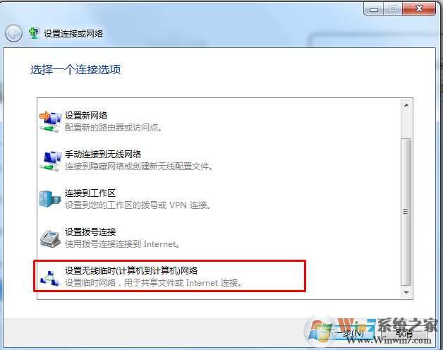 3、然后选择设围起无线临时(计算机到计算机)网络,再点下一步;