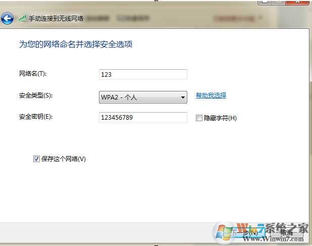 4、自己随便输入一个网络名。和密码再钩选下面的保存这个网络。不然不能长期使用,再点下一步;